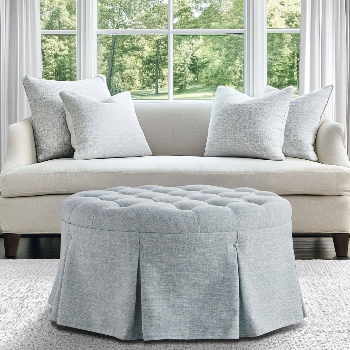 32" Light Blue Skirted Button Tufted Round Ottoman