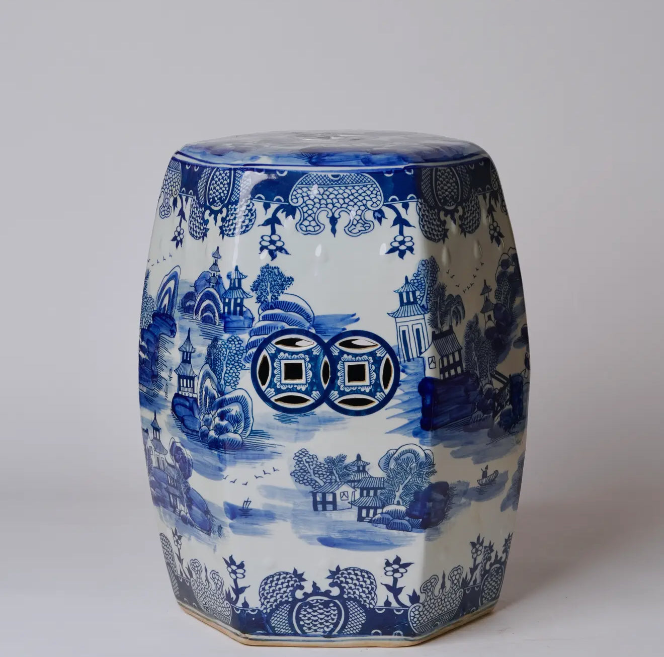 "Willow Ware" Blue and White Hexagonal Porcelain Garden Seat
