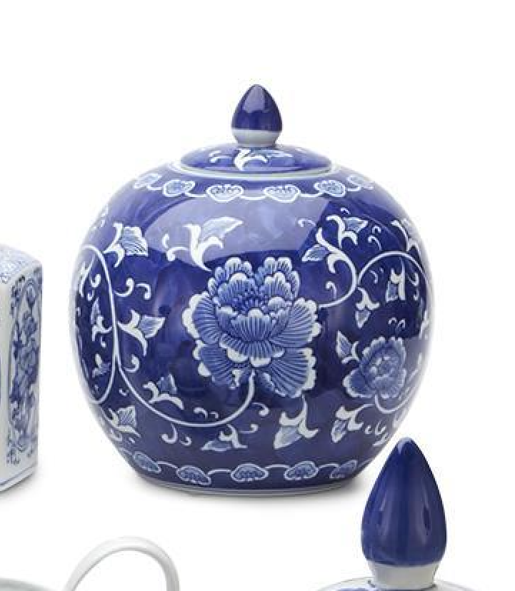 PORCELAIN TEMPLE JAR- BLUE AND WHITE