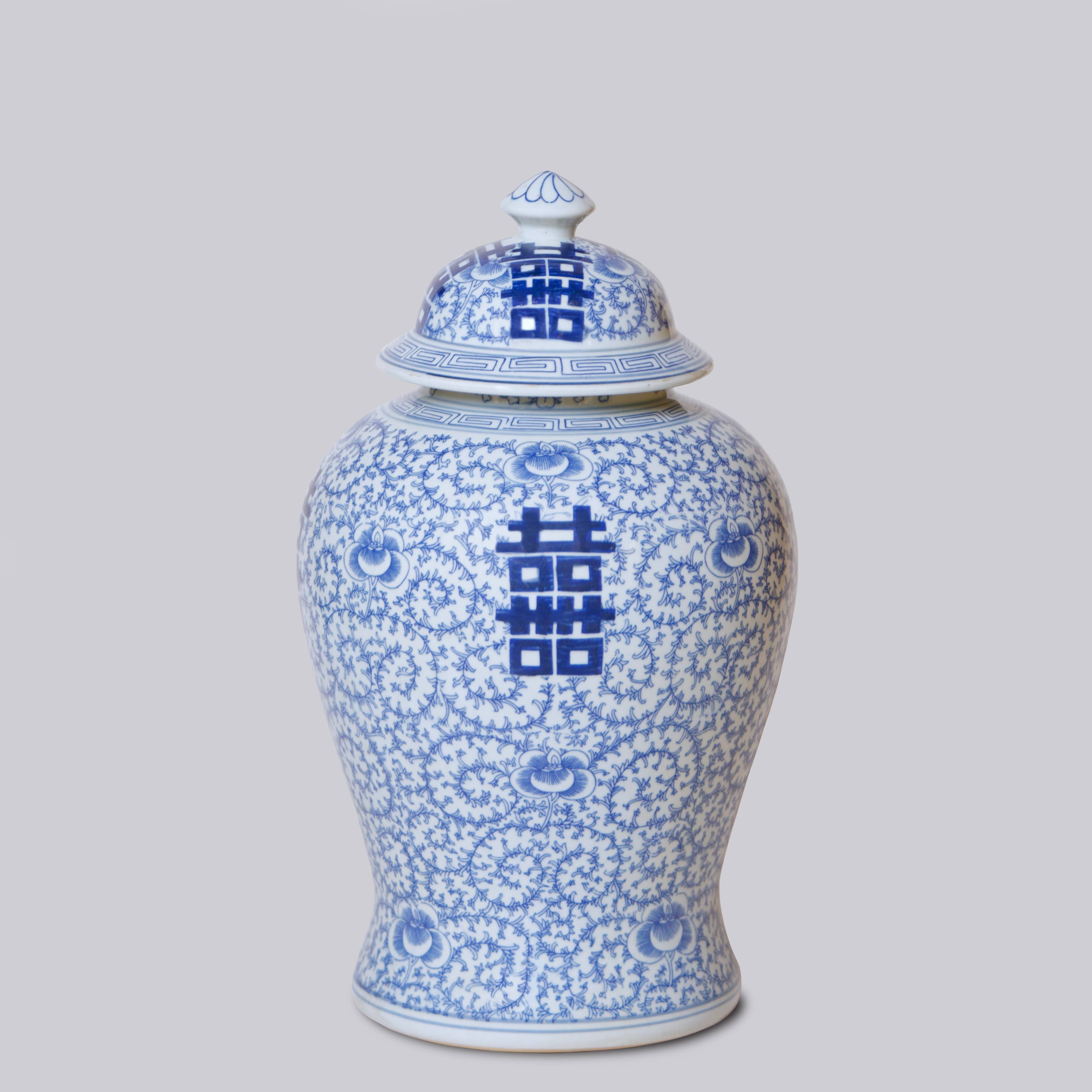 Double Happiness/Scrolling Peony Blue and White Temple Jar